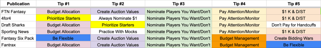 This is why we tend to get content focused on ‘auction tips’ rather than strategic based articles, but this content is far too repetitive, year-after-year. For example, I googled ‘fantasy football auction tips’ and tracked the tips provided from the top six search results (the results you’re most likely to click).
